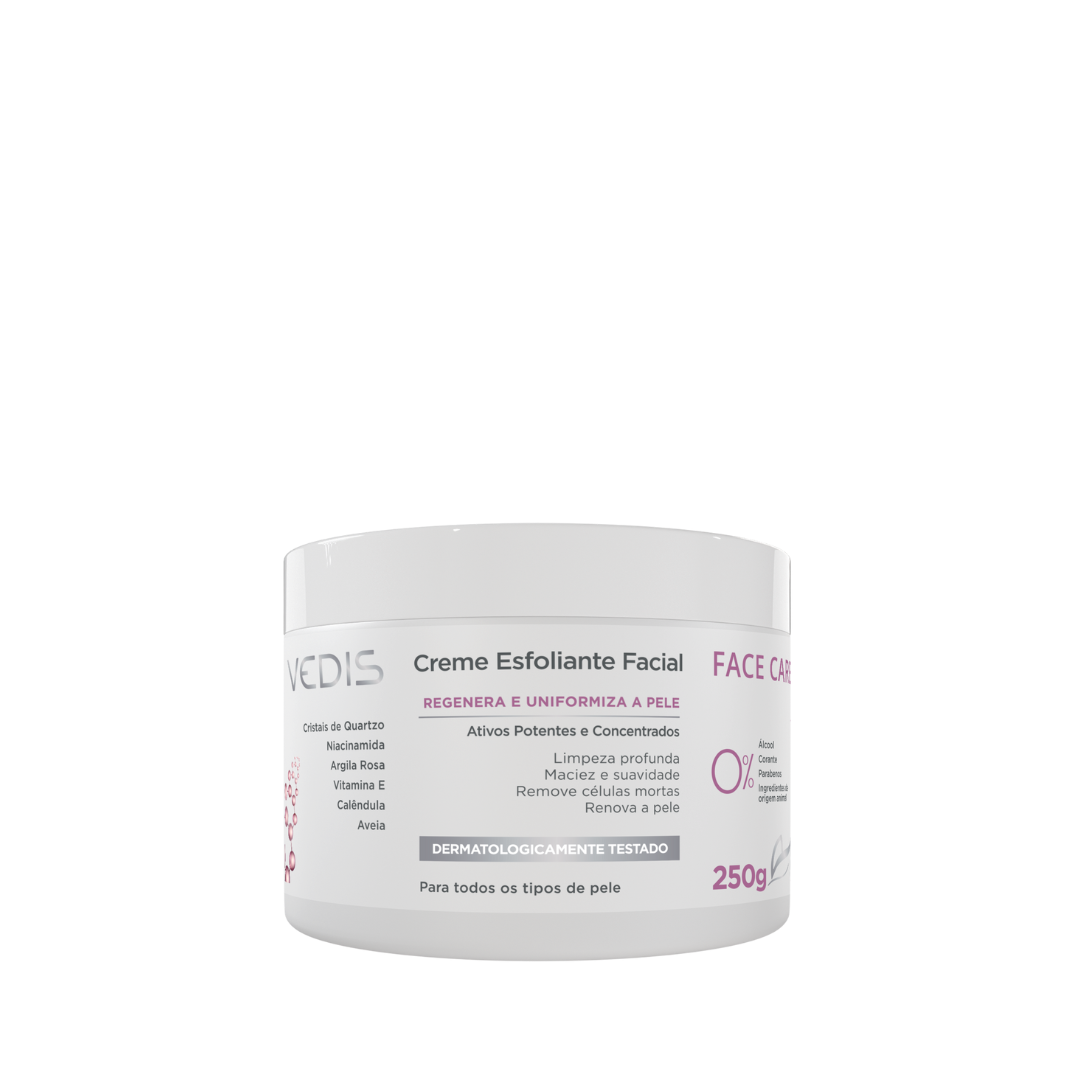 O Creme Esfoliante Facial Face Care elimina a camada de células mortas, remove impurezas enquanto hidrata e renova a pele. Faz uma limpeza profunda, graças à sua fórmula enriquecida com Cristais de Quartzo, que promovem uma esfoliação mecânica eficaz, eliminando as células mortas, desobstruindo os poros e removendo as impurezas. Contém Niacinamida, Argila Rosa, Extrato de Calêndula e Aveia que agem regenerando, uniformizando, hidratando, acalmando e cuidando da pele durante o processo de esfoliação. Com ação antioxidante devido à presença de Vitamina E, combatendo os radicais livres. O resultado é uma pele mais lisa, macia, e melhor preparada para absorção dos ativos.